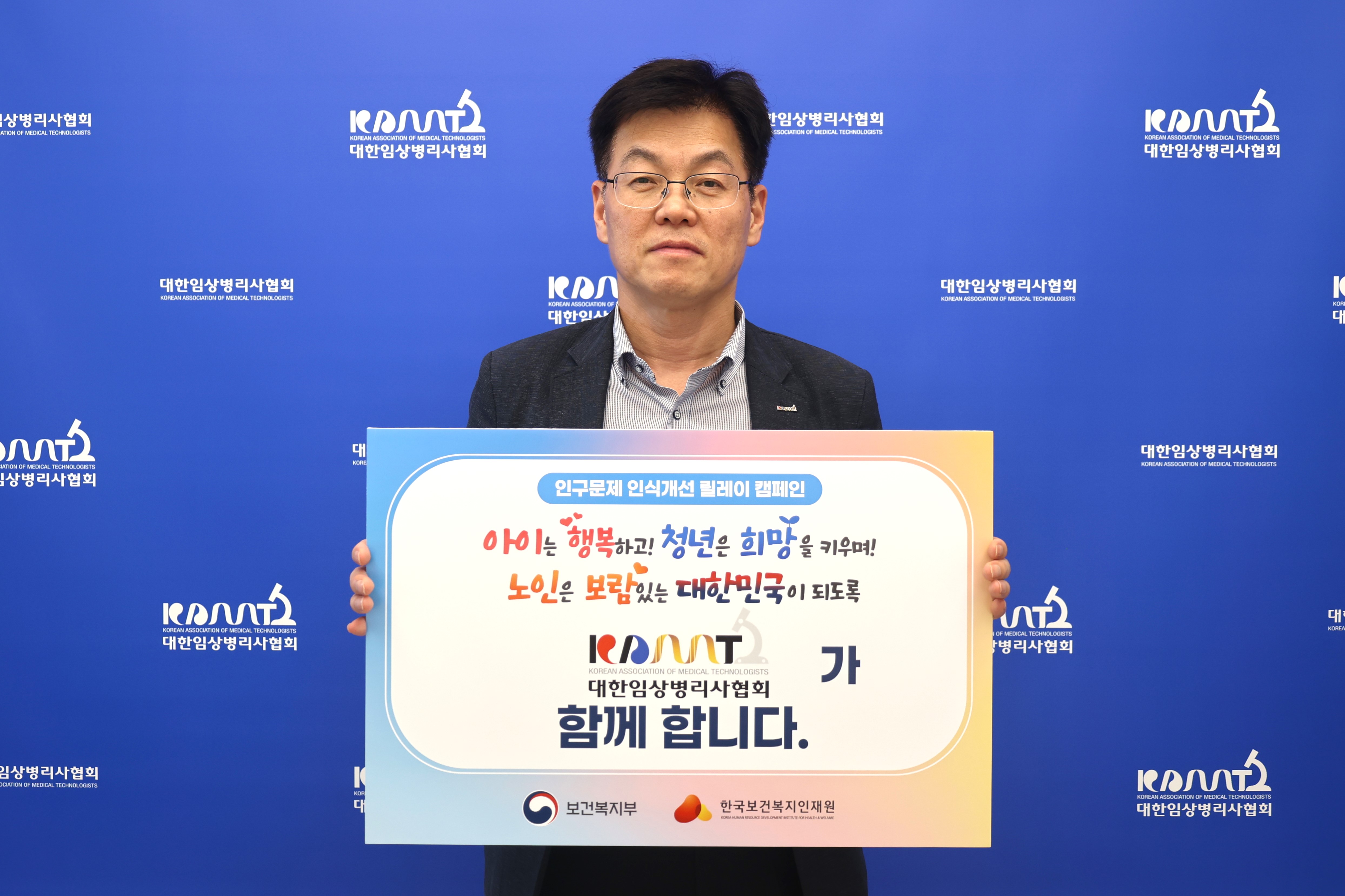 사단법인 대한임상병리사협회 이광우 협회장이 7월 10일(목) 대한임상병리사협회관에서 보건복지부와 한국보건복지인재원이 공동 주관하는 ‘인구문제 인식개선 릴레이 캠페인’에 참여했다.